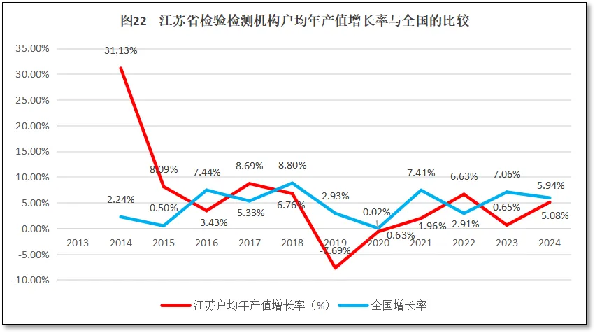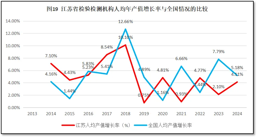 再来看江苏省检验检测机构人均年产值增长率与全国人均年产值增长率的比较,如图19所示。