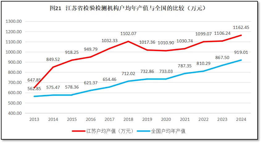 由图20可见,江苏省检验检测机构户均营业收入在2017年突破1000万元大关,在此之后增长率开始走低,户均营收保持在1100万元左右徘徊,2019和2020年还出现了小幅下降。江苏省检验检测机构户均年产值过去12年的平均年增长为5.83%左右,2024年的增长率为5.08%,总体保持稳定。